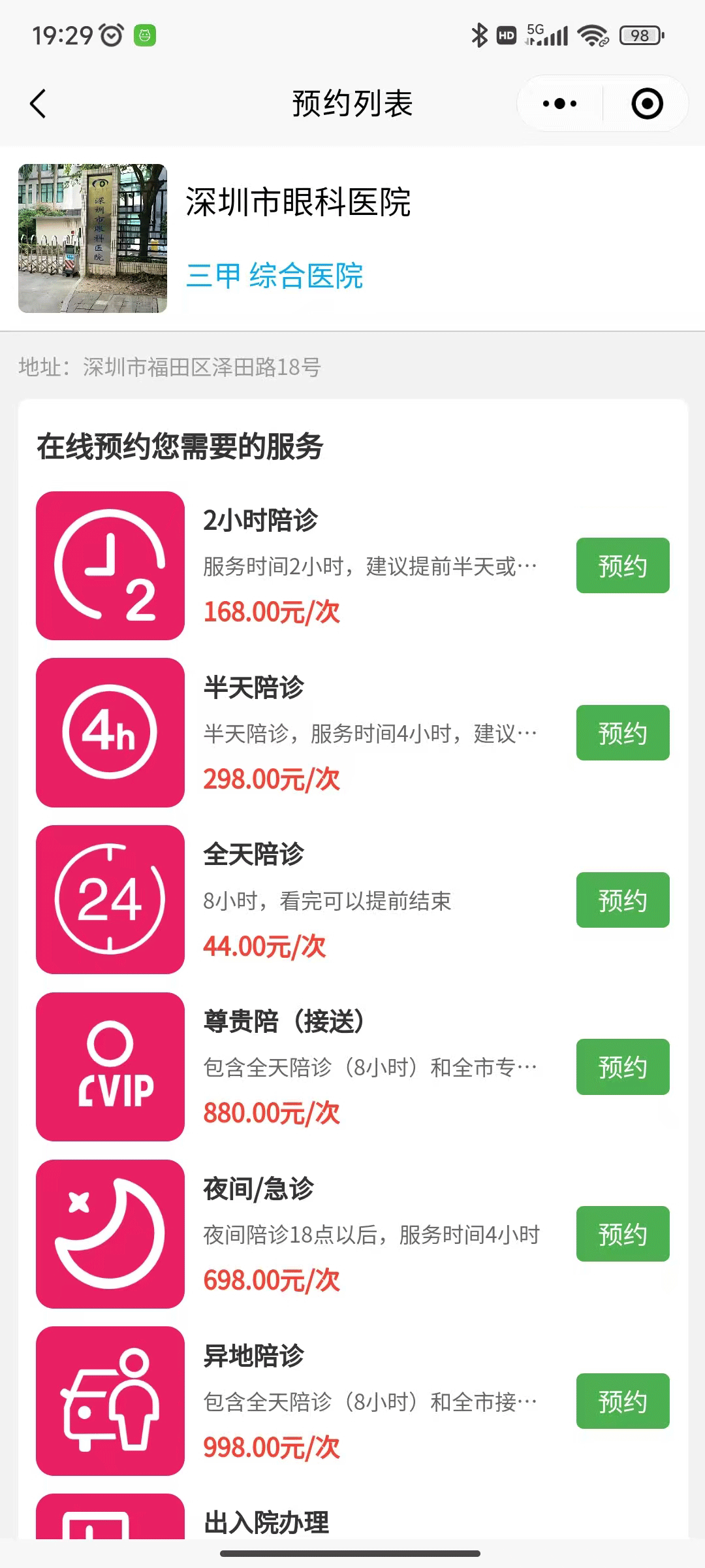 点击首页的医院,进入医院服务列表。用户可以在该列表上选择2小时陪诊、半天陪诊、全天陪诊等各种服务。